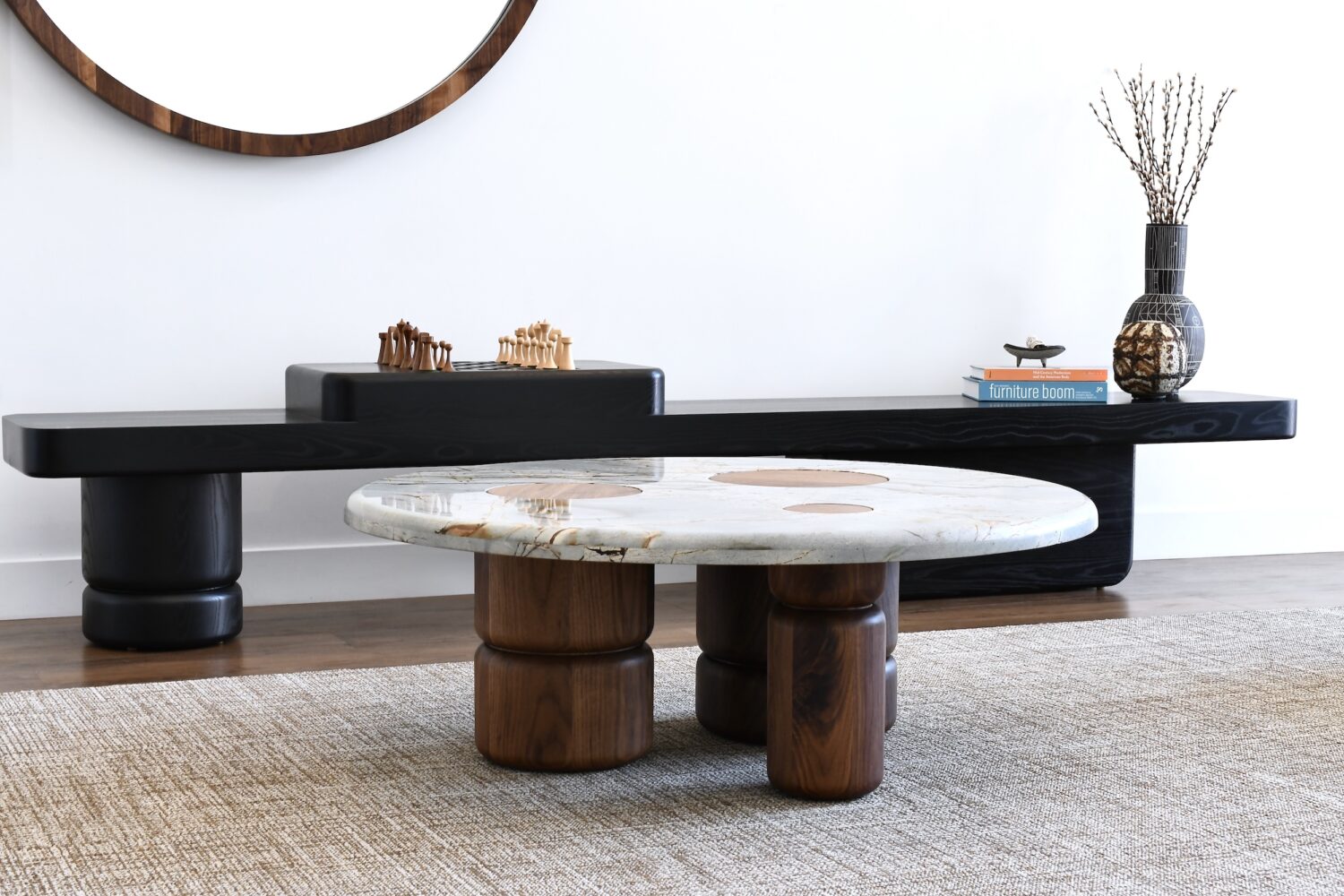 The Nostromo Bench stands out with its minimalist design inspired by the Brutalism movement. The solid wood top seamlessly pairs with the sculpted rectangular base and column. The game board adds a touch of nostalgia and sparks conversation.